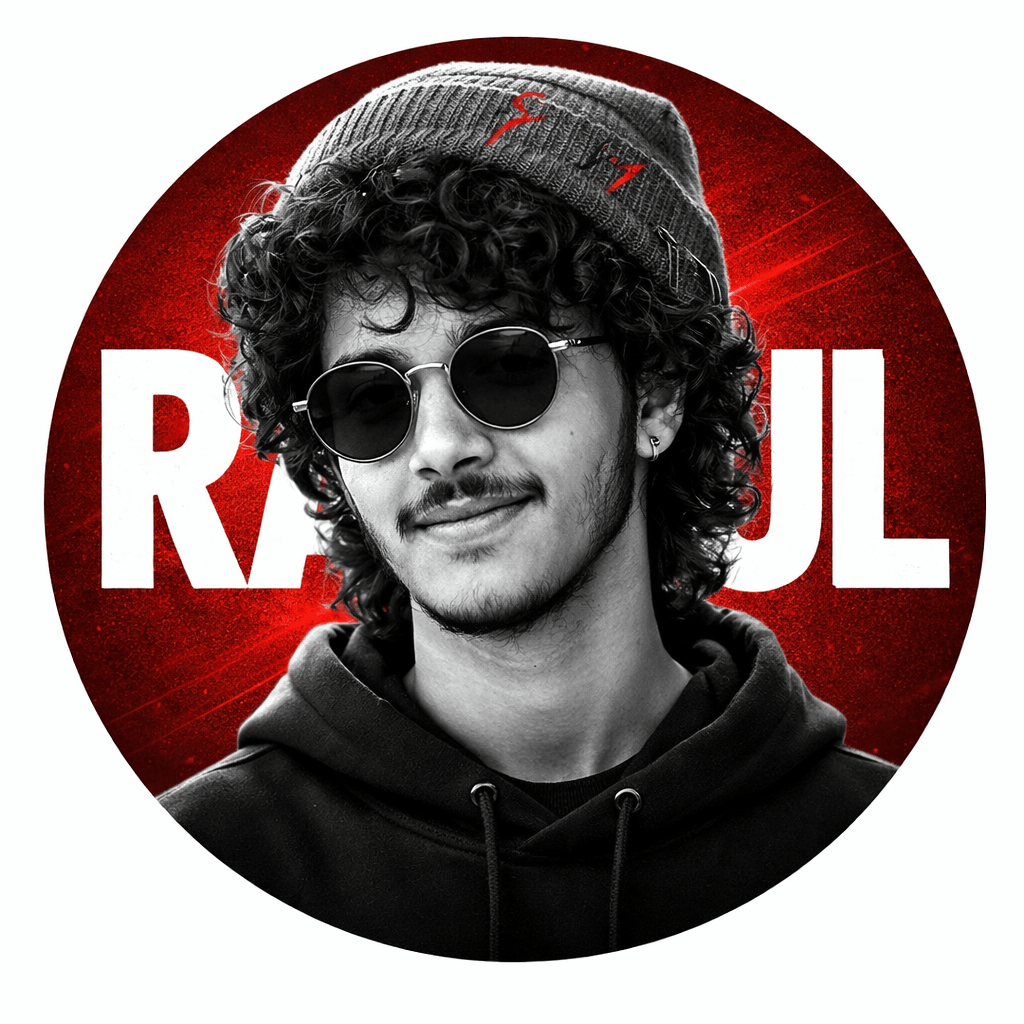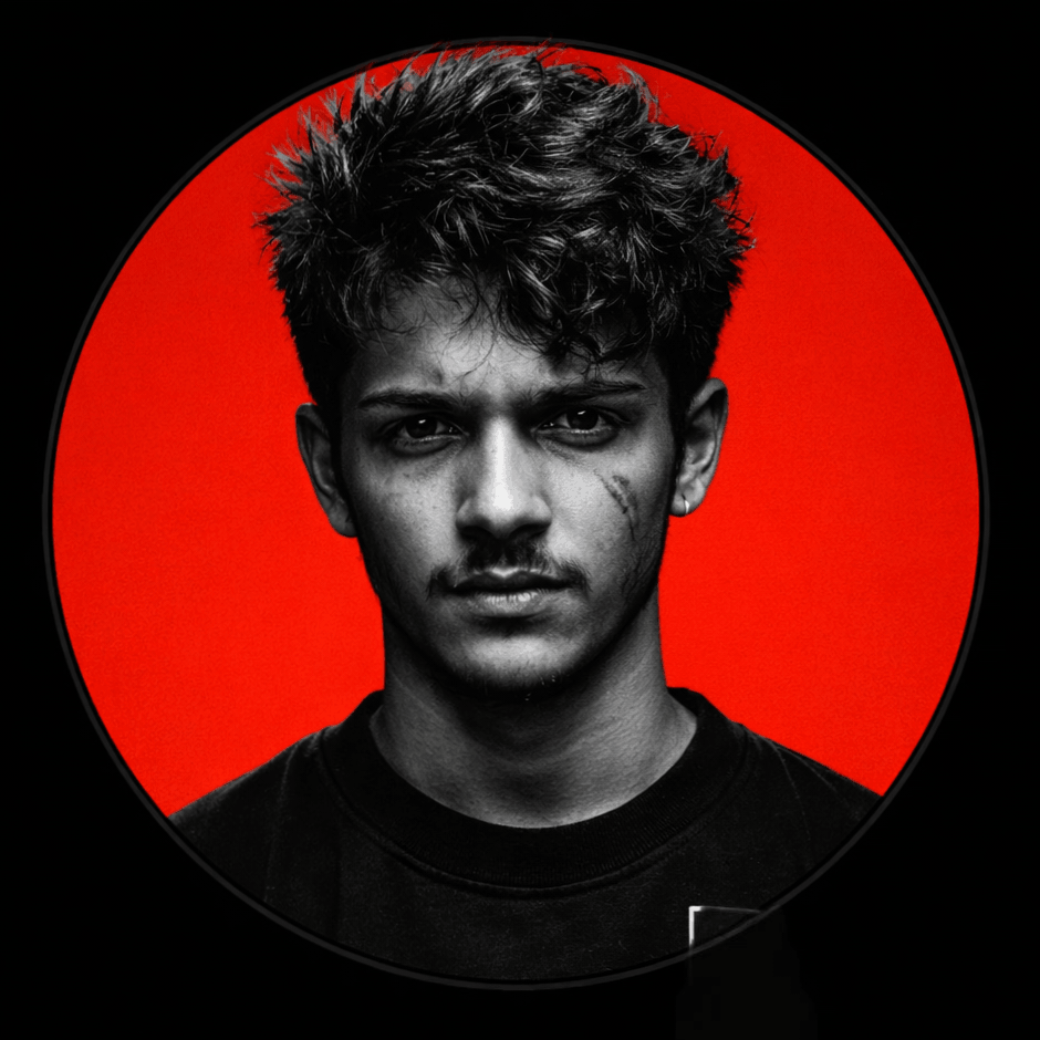 Ultra-realistic cinematic black and white portrait of a rugged young male, intense serious expression, direct eye contact, sharp jawline, short spiky textured hair, subtle scar on right cheek.Centered symmetrical close-up (head and shoulders), straight-on angle, neutral posture.High contrast grayscale face with dramatic lighting and deep shadows, gritty raw skin texture.Circular crop composition, solid bright red background inside circle (#ff0000), pure black background outside circle, thin black outer edge.Wearing a casual graphic t-shirt.Moody studio lighting, sharp focus, DSLR quality, 8k, bold minimal poster design, high contrast monochrome subject with red background, for Profile picture/Instagram dp suitable. Generate image.