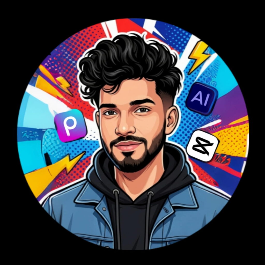 Digital vector illustration of a confident young male content creator, esports avatar style. The subject has tan skin, a sharp jawline, light stubble, and voluminous messy curly black hair with an undercut.He is wearing a blue denim jacket over a black hoodie with white drawstrings. He has a smirk on his face. The composition is circular with a vibrant abstract background featuring red, white, and blue geometric shapes and halftone patterns. Floating around him are glossy 3D app icons for “PS” (Photoshop), “Ae” (After Effects), and “CP” (CAPCUT), along with jagged yellow lightning bolts. High contrast, clean thick outlines, sticker art aesthetic.
