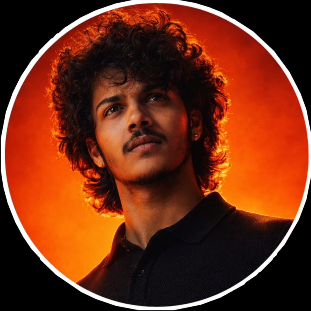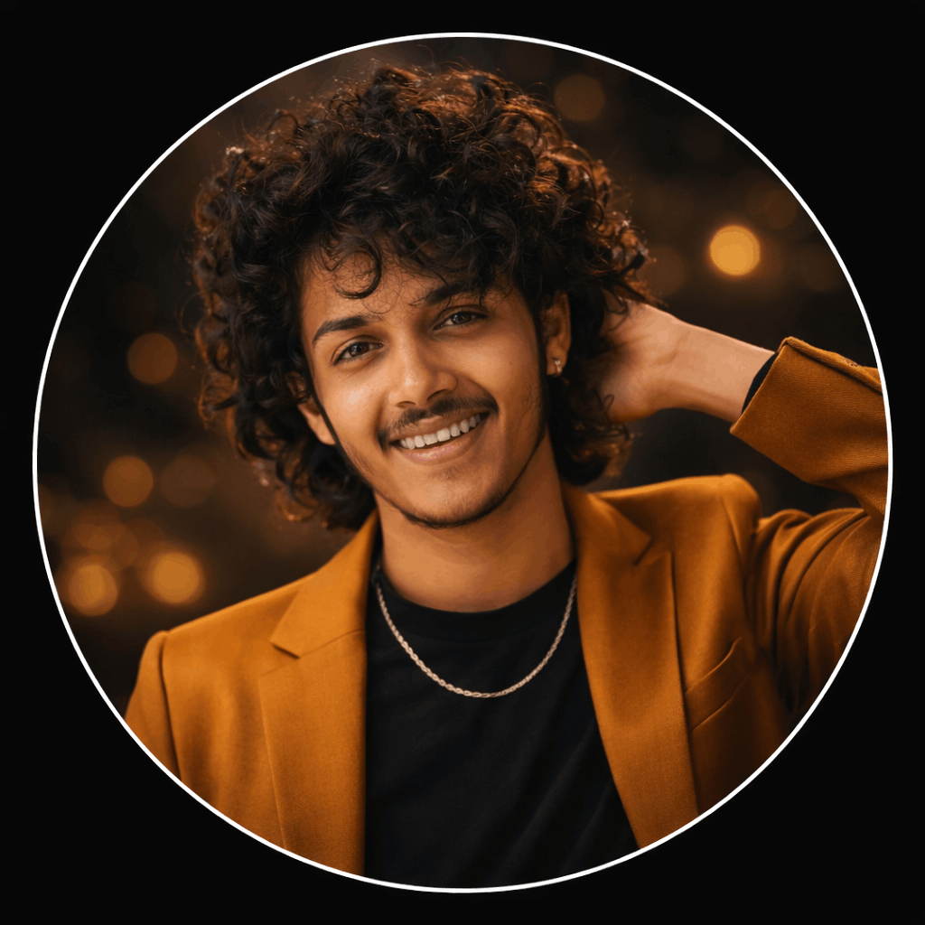Ultra-realistic cinematic portrait of a stylish young adult, circular crop with thin white outline, solid black background outside the circle. Wearing a golden-orange blazer over a black top with a silver chain necklace. Natural confident smile, right hand behind head in relaxed pose, (for girls, edit the pose) thick. Dark blurred background with warm golden bokeh inside the circle. Professional studio lighting, warm tones, soft shadows, sharp focus, realistic skin texture, shallow depth of field, DSLR quality, cinematic color grading, ultra-high resolution, photorealistic.Negative Prompt: low quality, cartoon, anime, blurry, overexposed, extra fingers, distorted face, unrealistic skin, harsh shadows.Generate image.