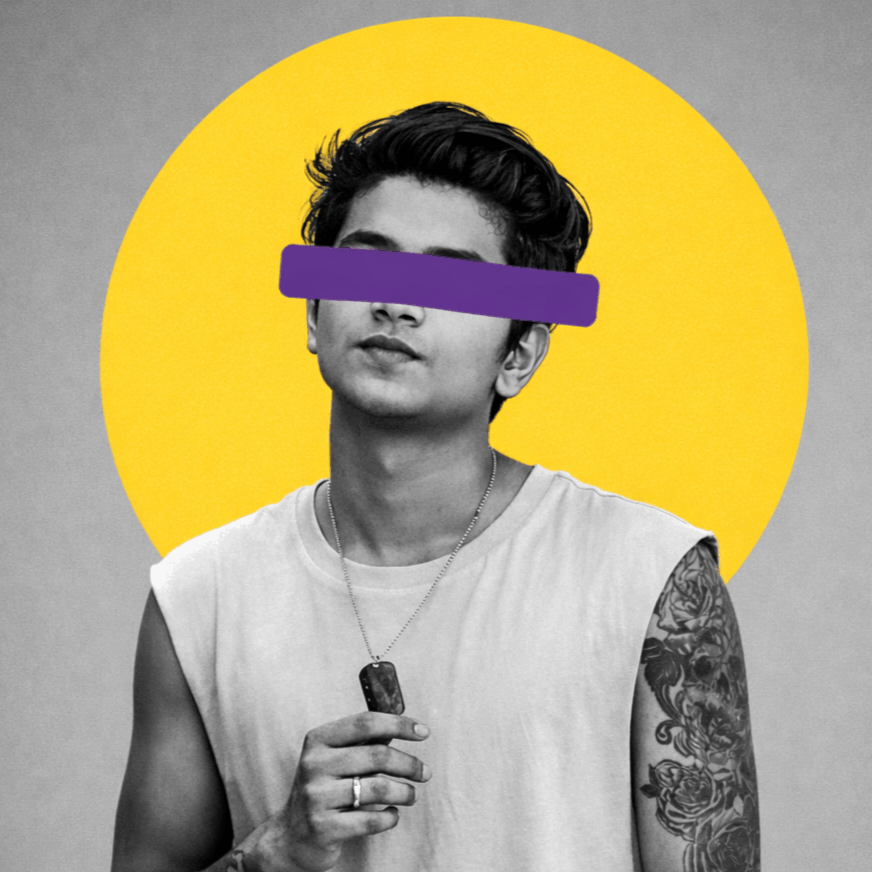 Lighting: soft studio frontal lighting with subtle shadow depth, realistic contrast, no dramatic highlights.Graphic overlay: place place a solid purple horizontal bar across the eyes, opaque, flat color, rounded corners, slightly wider than the face, positioned precisely at eye level.Typography: at the top center, add the text “ATTITUDE HOLIC” in uppercase, minimal minimal geometric g block font. Each letter placed inside small black square boxes with white lettering. Keep text subtle and evenly spaced.Style: minimalist poster design, modern attitude aesthetic, clean composition, no extra elements, no visual noise.Aspect ratio: vertical portrait (4:5): Ultra-sharp, professional, realistic finish.