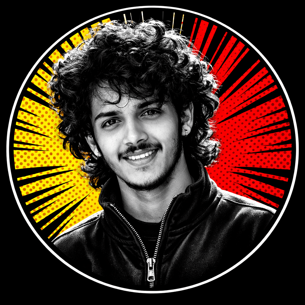 Ultra-realistic pop-art cinematic circular DP.Use uploaded photo as the only facial reference with absolute identity lock.Do not alter skull structure, jawline, cheek volume, chin shape, nose bridge, lips, eye spacing,eyebrow density, beard pattern, hairline, natural asymmetry, or skin texture. Preserve real pores.No smoothing, reshaping, or artificial sharpening.Pose correction: rotate from strict side profile to 3/4 front-facing angle (about 25-35° turn). Botheyes clearly visible. Nose bridge and jawline fully defined. Keep same expression and natural posture.Outfit: same black high-neck zip jacket with visible zipper detail.Lighting: directional key light from front-left for facial clarity, controlled shadow on far cheek,subtle rim light on hair for separation. High-contrast black-and-white subject.Background: bold comic-style circular backdrop split vertically – left yellow halftone dots, rightred halftone dots. Black radial burst lines expanding from center behind head. Clean vector finish.Composition: centered inside perfect circle frame, upper torso crop, no outer white border.