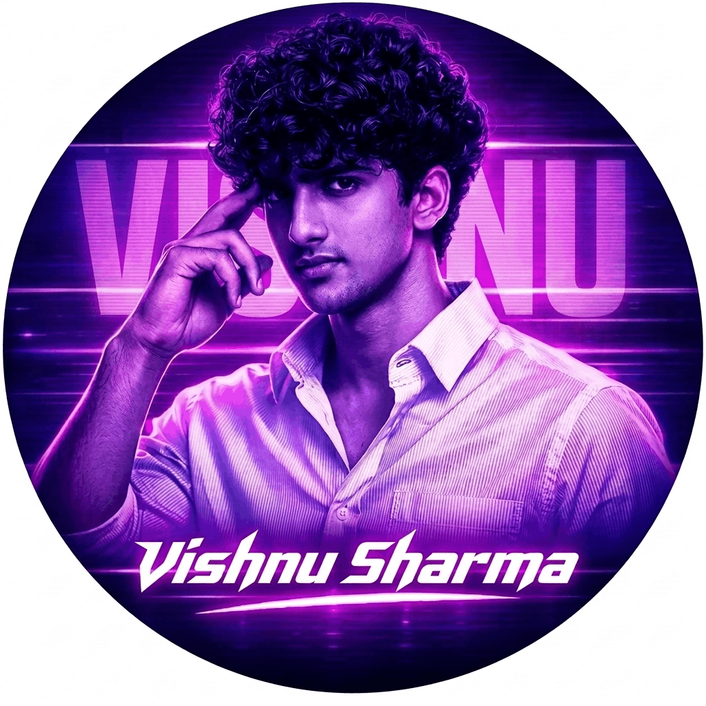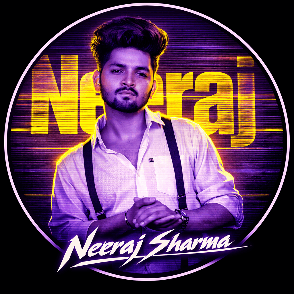 “A circular profile picture design featuring use given image. The image has a strong monochromatic purple and neon yellow aesthetic. The background features large, translucent block text reading ‘Neeraj’ and a horizontal CRT scanline texture overlay. At the bottom, there is sharp, stylized white text that reads ‘Neeraj Sharma’. High contrast, digital fan art style, glowing neon lighting.”